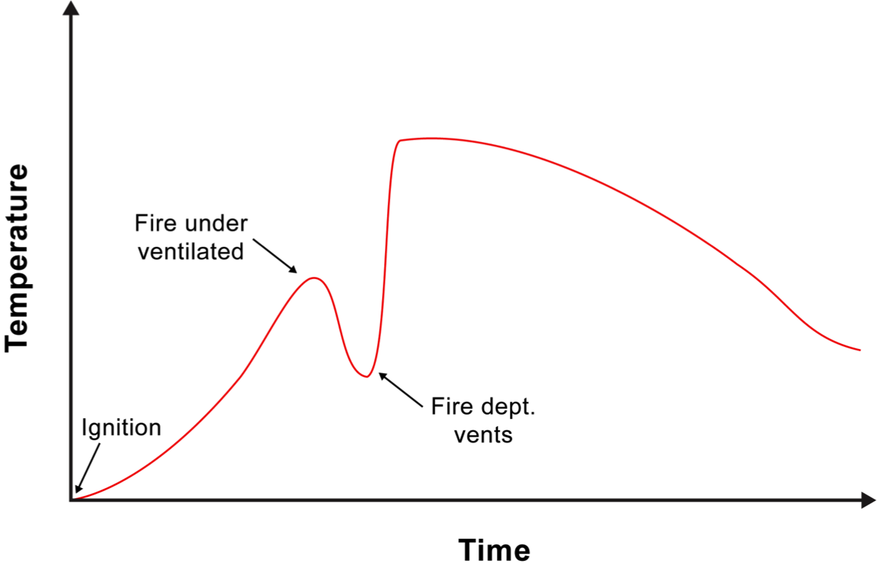 The article starts out focusing on how oxygen hungry today’s fires are, how imperative it is to address ventilations as a top priority at every fire, and how opening a door to the occupancy provides a tremendous source of fresh air to the fire. In the today’s fire behavior picture below note the status of the fire pre-ventilation and then post ventilation. Any opening that is provided either by action of the FD or by the fire (window self venting, especially older non thermo-pane windows) will provide a source of fresh air to the fire. Personnel should expect the fire to react accordingly.
